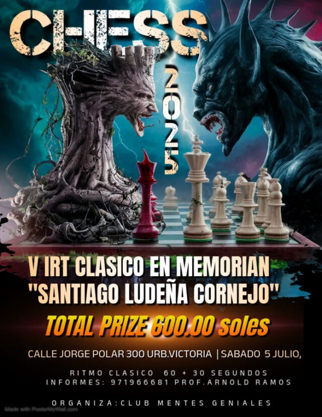 ¡El ajedrez se apodera de Arequipa! ♟️ Únete a nosotros el 5 y 6 de julio de 2025 para el V Torneo de Ajedrez IRT Clásico en honor a Santiago Ludeña Cornejo. Un evento que reunirá a los mejores jugadores y a todos los apasionados de este arte. ¡No te quedes fuera, regístrate ya! 🏅