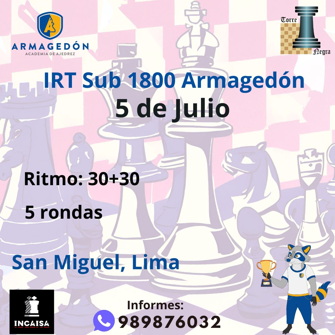 ¡El desafío está a la vuelta de la esquina! 🔥 Únete el 5 de julio al IRT Clásico Sub 1800 Armagedón en San Miguel, Lima. La cita es en Manco II 307 (Altura de Rafael Escardó cuadra 3). No dejes pasar la oportunidad de brillar en el tablero.