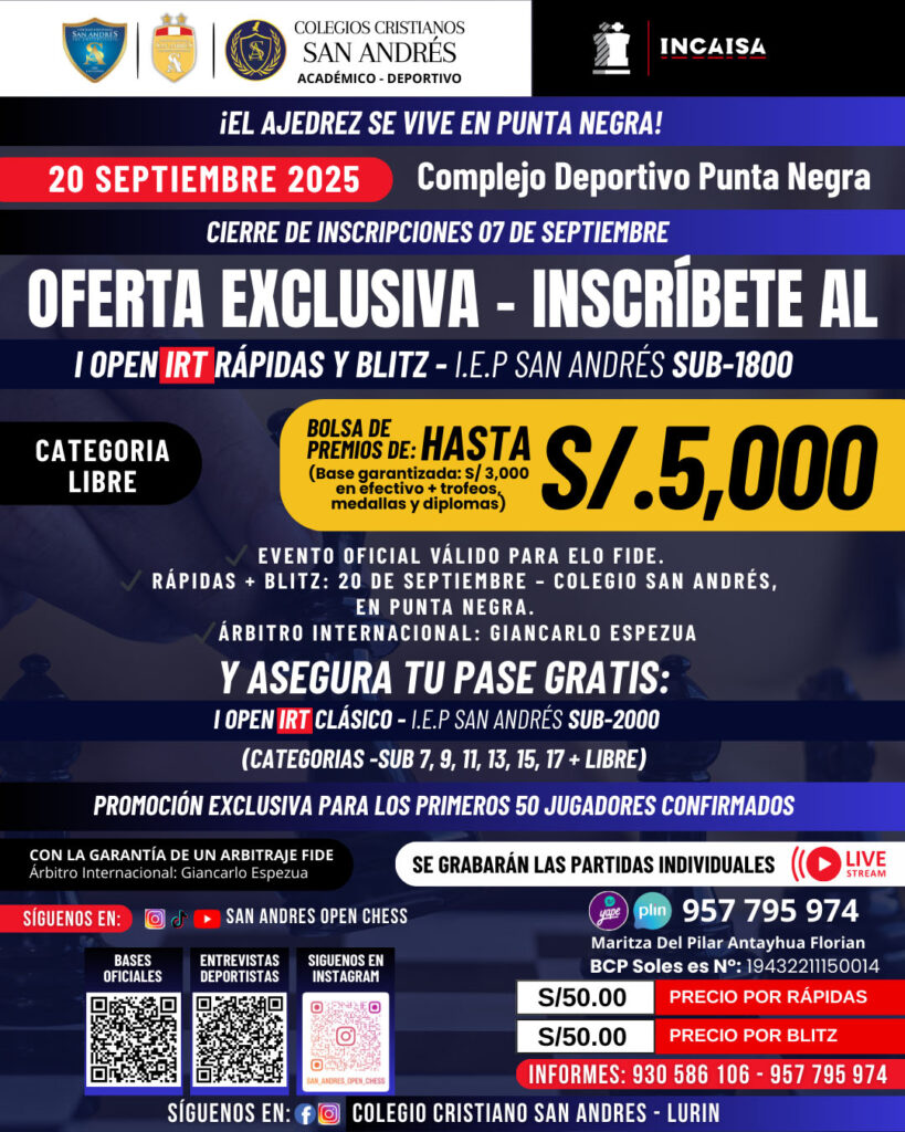¡Es hora de hacer jugadas maestras! 🏆 El Colegio Cristiano San Andrés invita a todos los ajedrecistas y clubes a participar en el I OPEN IRT RÁPIDAS Y BLITZ – I.E.P SAN ANDRÉS «SUB-1800». Ven a mostrar tu talento y a descubrir nuevas promesas del ajedrez. ¡Inscríbete ya y sé parte de esta gran experiencia!
